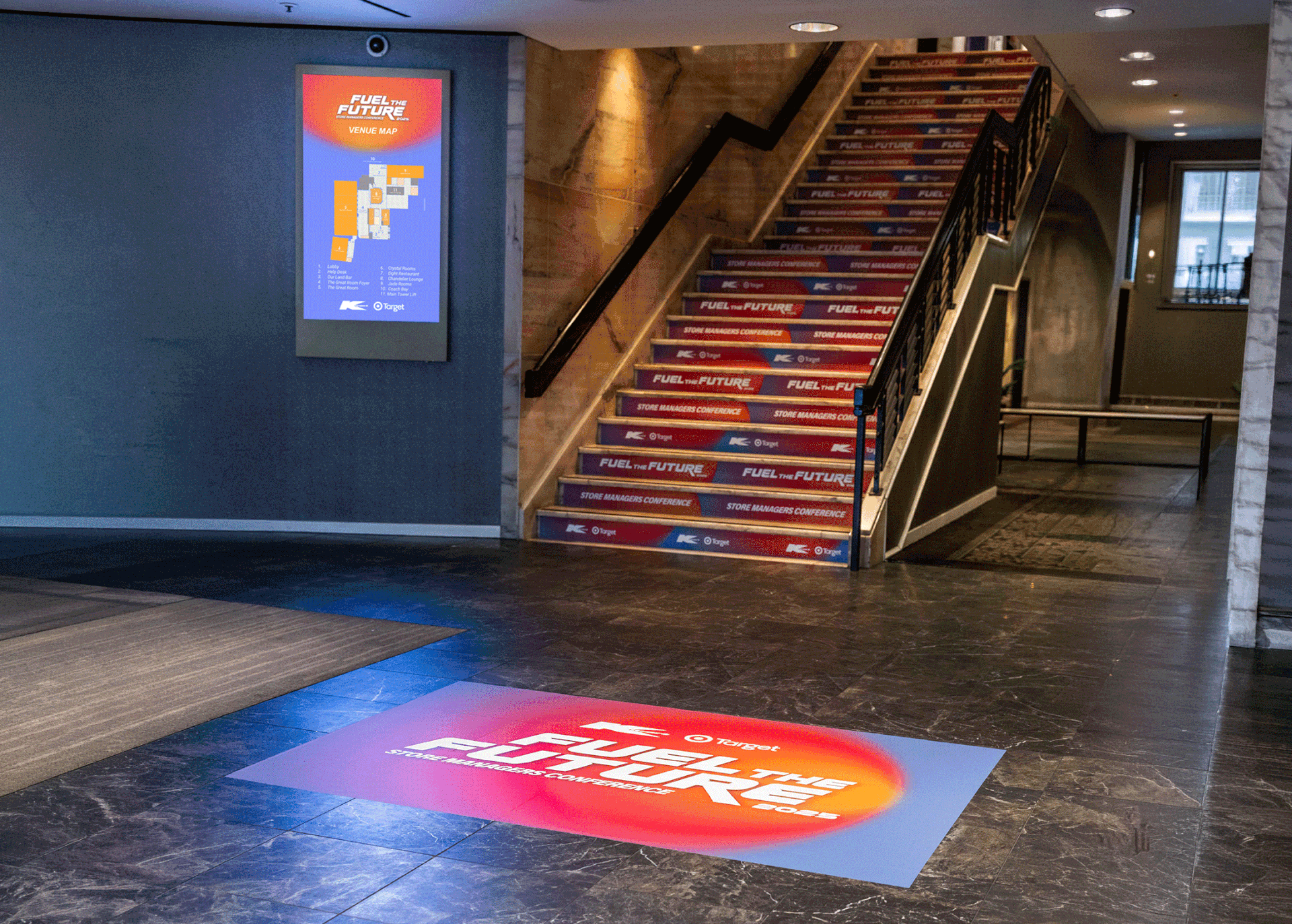 A major part of the role involved animating and programming PowerPoint sequences across multiple screens, synchronising all audio, visual, lighting and digital outputs to deliver a seamless, high-impact experience. I also designed content for digital screens, directional signage, event updates and in-room graphics, ensuring everything connected cohesively to the event’s “Fuel The Future” theme.