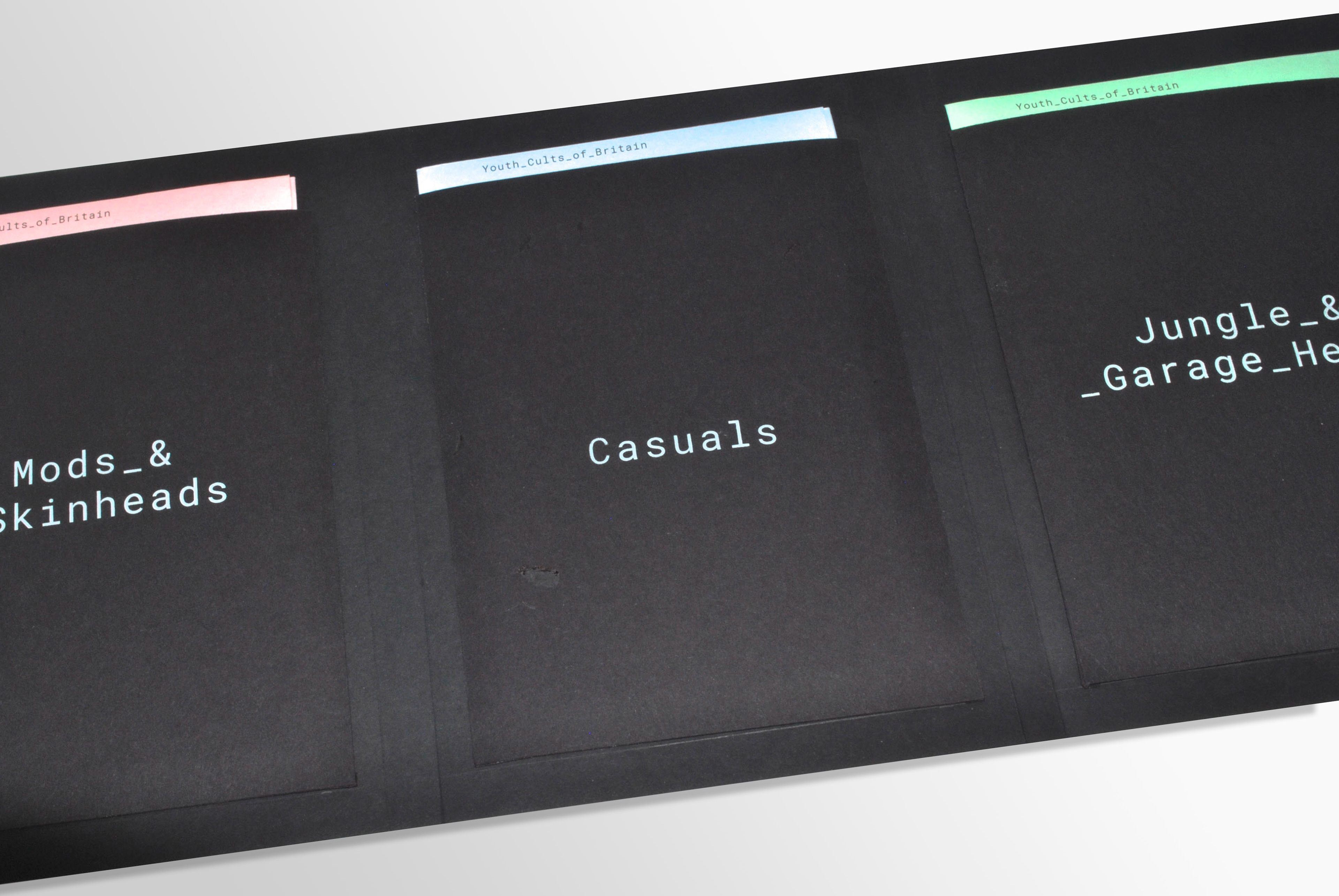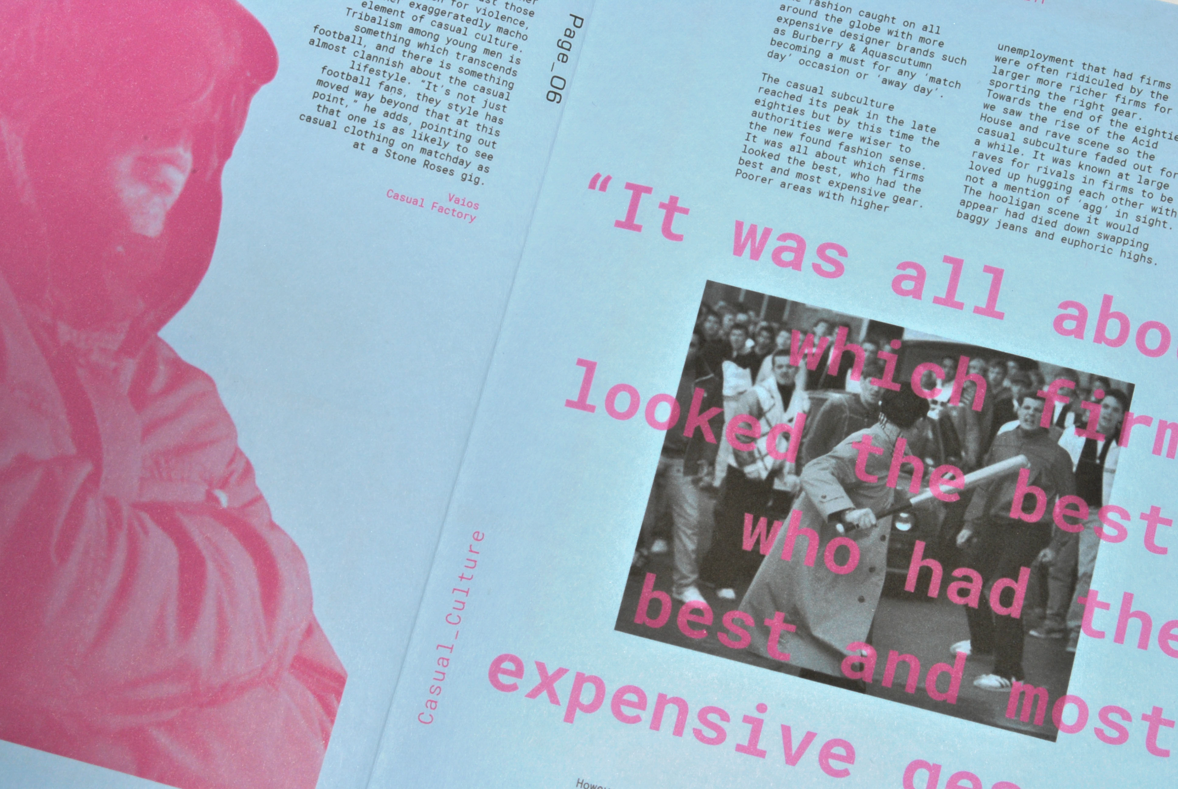 The series of 3 looks specifically at the mod & skinhead revivalists, casuals, and jungle and garage heads. Each of these were pioneers of their time respectively, and all still continue to influence fashion culture and trends in today's society. The backside of each of these zines all fit together creating a timeline and overview of other subcultures which existed in-between and around the same time as the other 3.